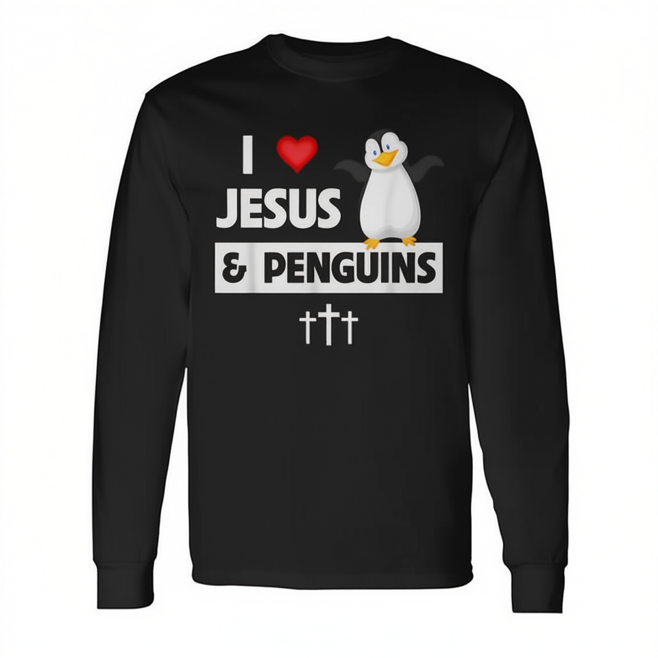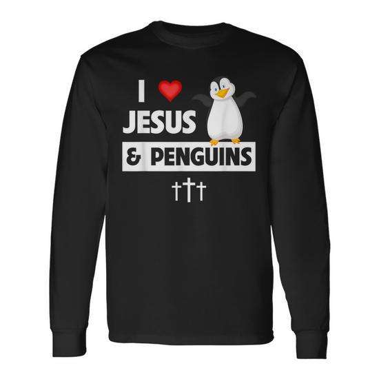T-shirt cristiana a maniche lunghe con stampa I Love Jesus And Penguins, design con uccello senza ali e Bibbia