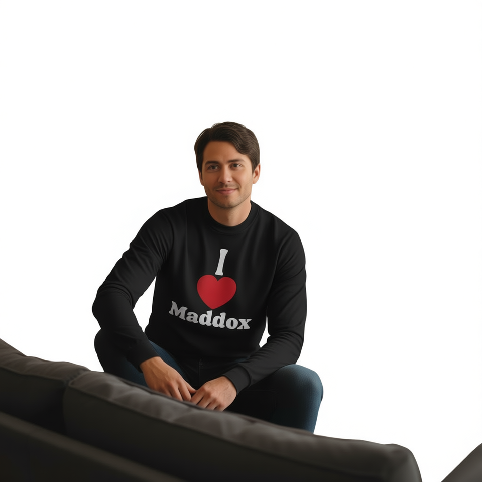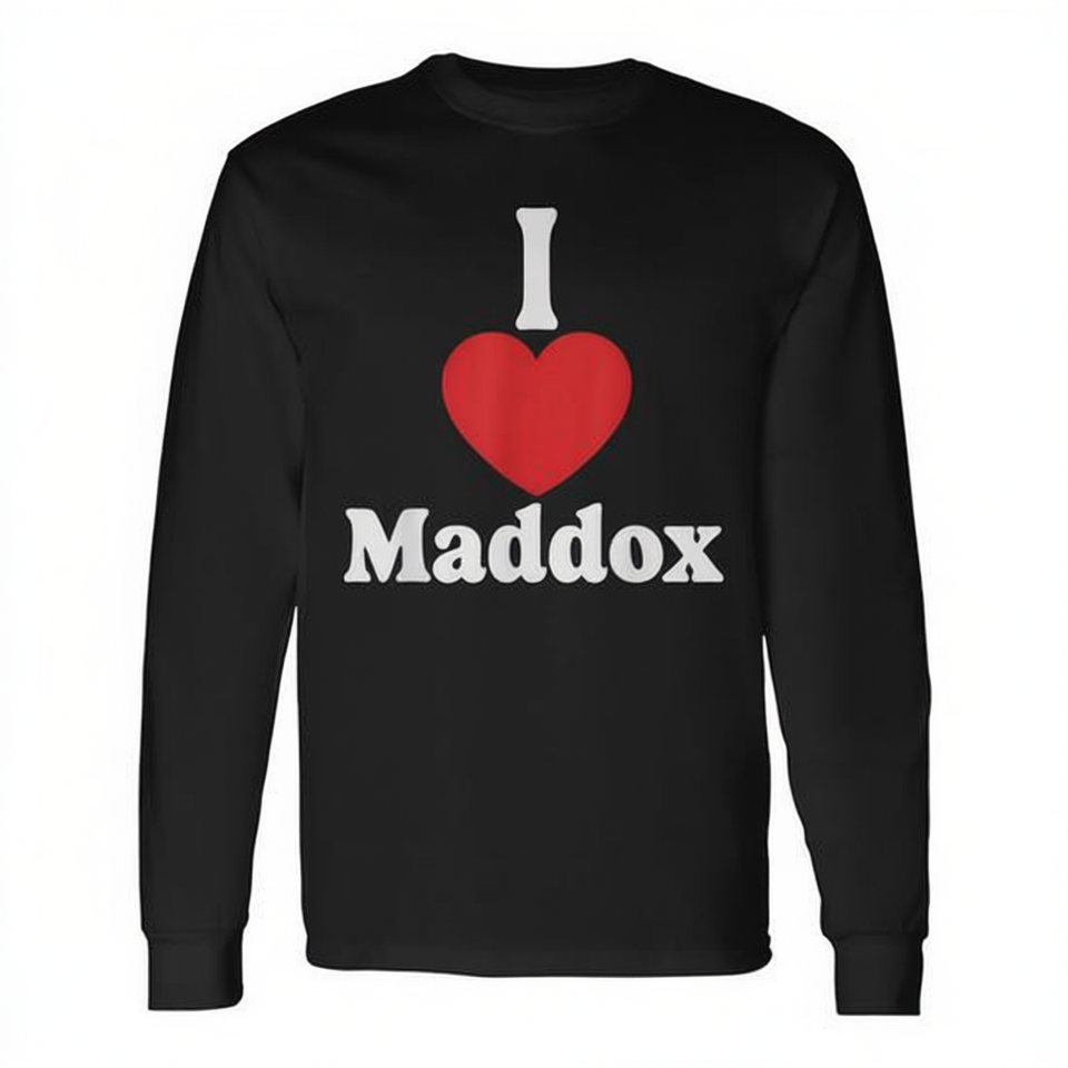 T-Shirt Personalizzata con Nome 'I Love Maddox', Manica Lunga, Girocollo, Unisex per Adulti, Stampa Digitale, Abbigliamento Promozionale