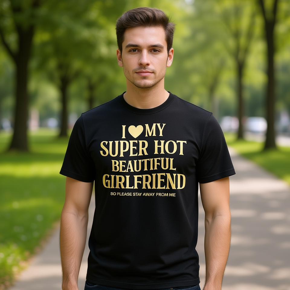T-shirt promozionale con scritta 'I Love My Super Hot Beautiful Girlfriend'