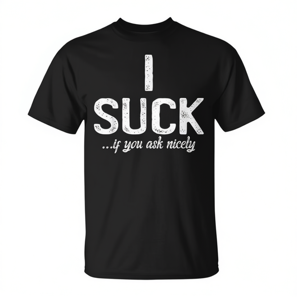 Maglietta promozionale con stampa 'I Suck If You Ask Nicely'