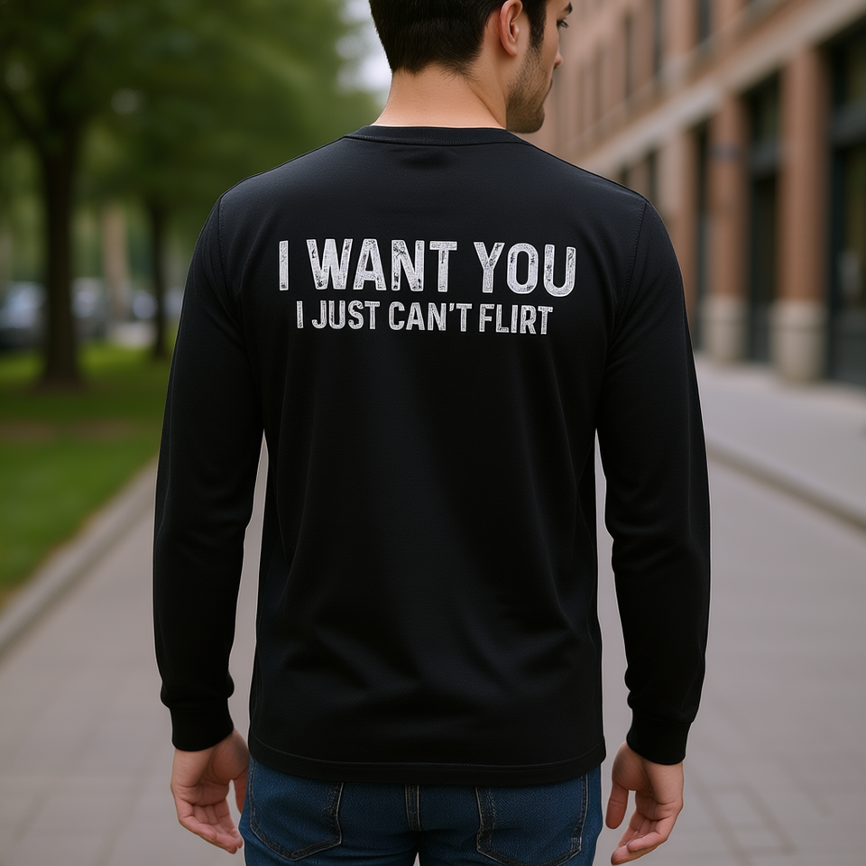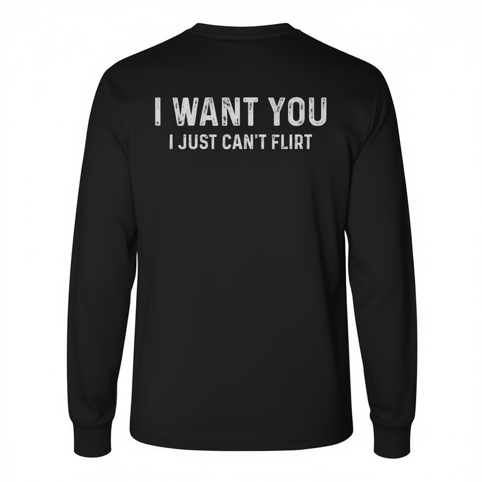 I Want You I Just Can't Flirt on Back Long Sleeve Promotional T-Shirt