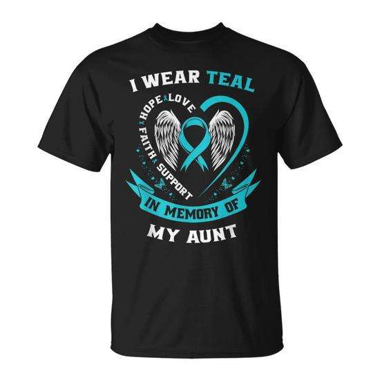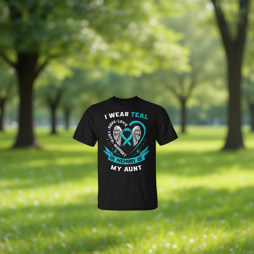 Indosso la maglietta color verde acqua per la consapevolezza sul cancro all'ovario della mia zia, con la fascia del riconoscimento del cancro all'ovario per bambini