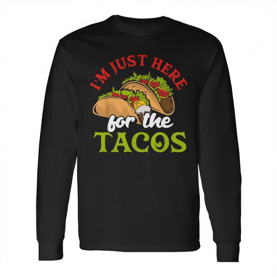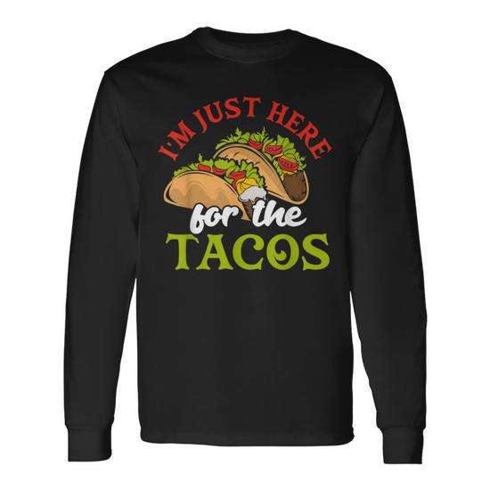 T-shirt a maniche lunghe con stampa digitale unisex, girocollo, design con gioco di parole sul cibo messicano: I'm Just Here For The Tacos