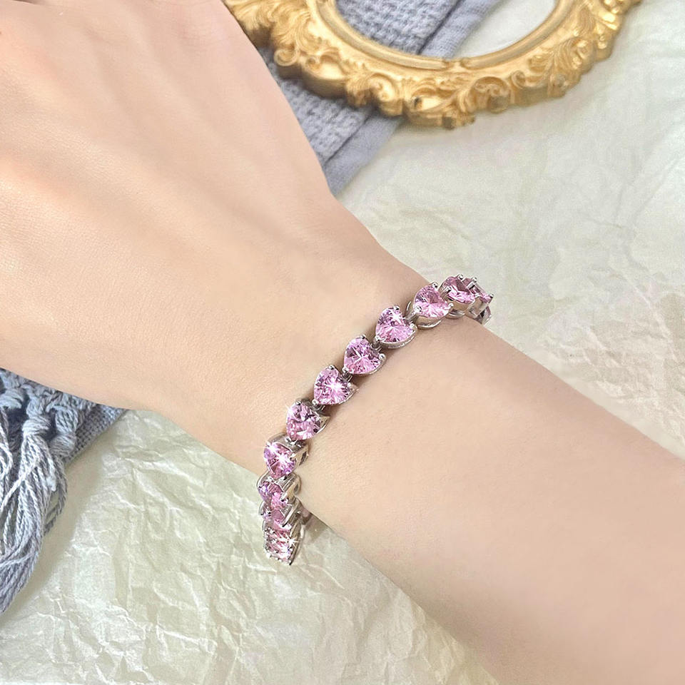 INS Trending Baby Pink Heart Tennis Chain Bracelet 925 Sterling Silver Ice Pink Fine Jewelry Cubic Zircon Heart Women Bracelets