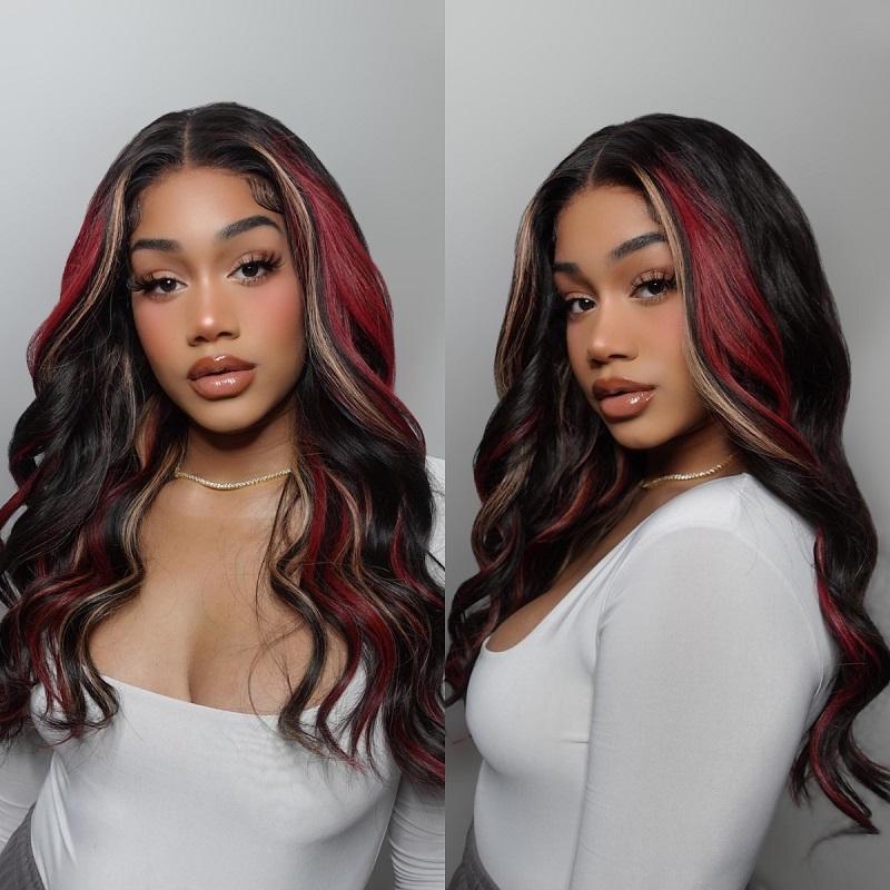 ISEE New Body Wave Wigs With 99J Burgundy Red Honey Blonde Highlights Piano Color Lace Front Human Hair Wigs For Black Women