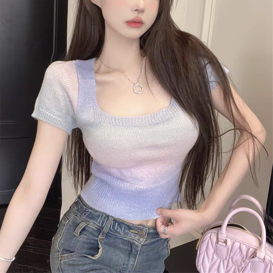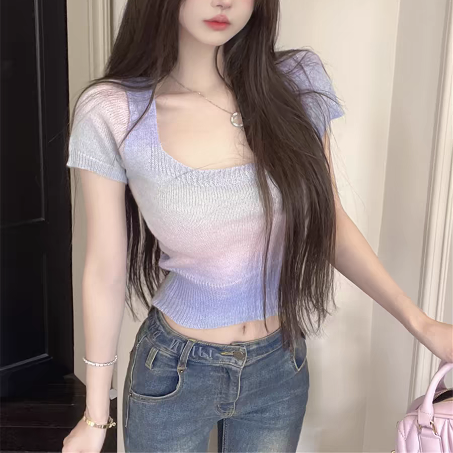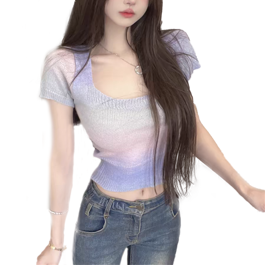 IWI046 Maglione Estivo da Donna Personalizzato, Stile Retrò a Righe, Traspirante, Antirughe, Lavorato a Maglia, Scollo Quadrato Scollato, Manica Corta, Casual