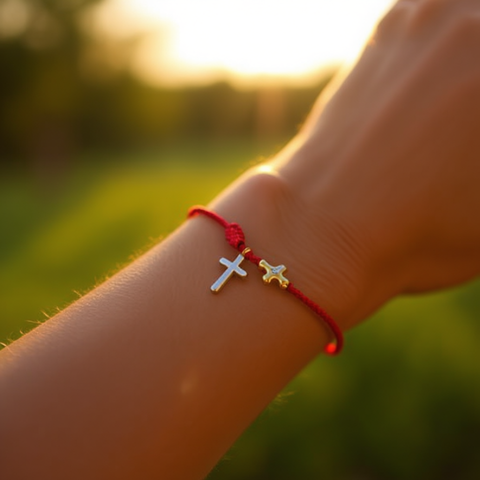 Braccialetto Ilan con 7 nodi, cordoncino rosso e ciondolo a croce color argento e oro