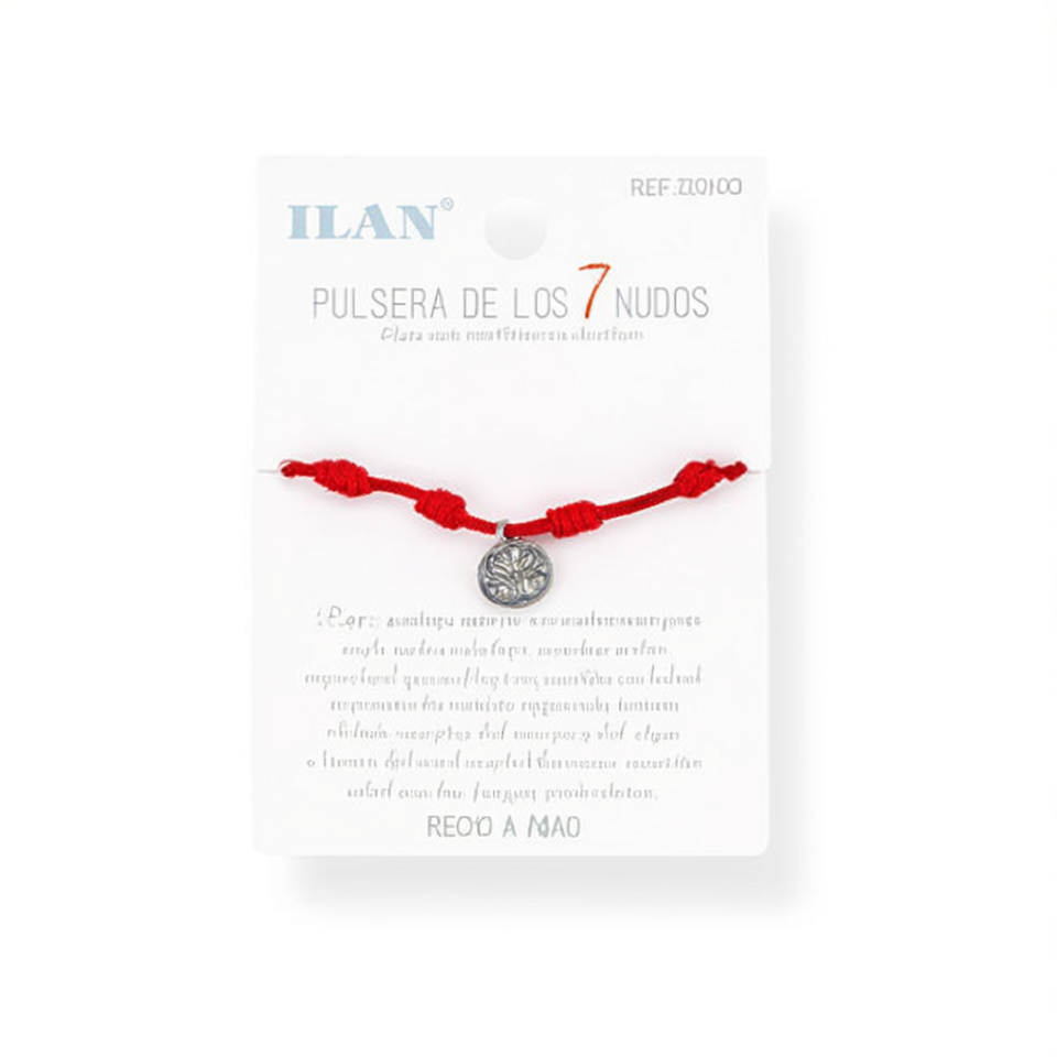 Braccialetto Etnico Ilan in Corda Macramè Piatta con 7 Nodi, Ciondolo Albero del Mondo in Corda Rossa, Colore Argento e Oro, Ecologico per Uso su Abbigliamento