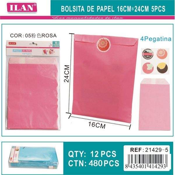Ilan Paper Bags 16x24 Cm 5Pcs Pink With Stickers For Gift Packaging