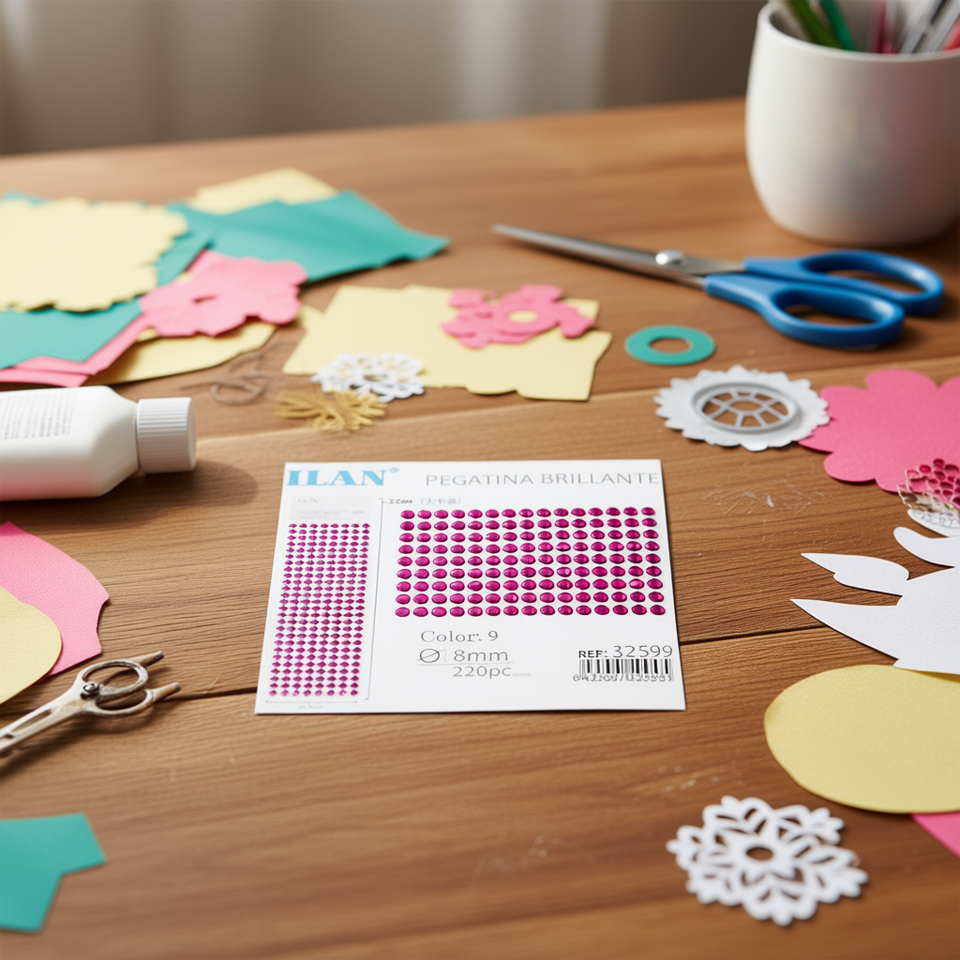 Ilan Adesivi Brillanti 8mm Fucsia con Strass, 220 Pezzi su Cartoncino Grande