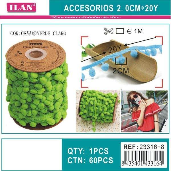 Nastro Ilan Pom Pom Verde, Larghezza 2.0 Cm, Lunghezza 20 Yd, per Decorazioni e Artigianato