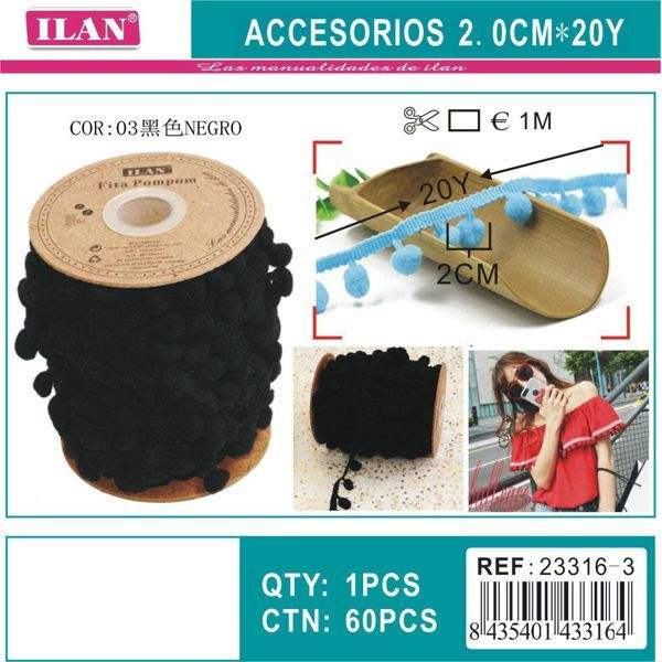 Nastro decorativo nero Ilan Pom Pom da 2,0 cm x 18 m per cucito e progetti fai da te
