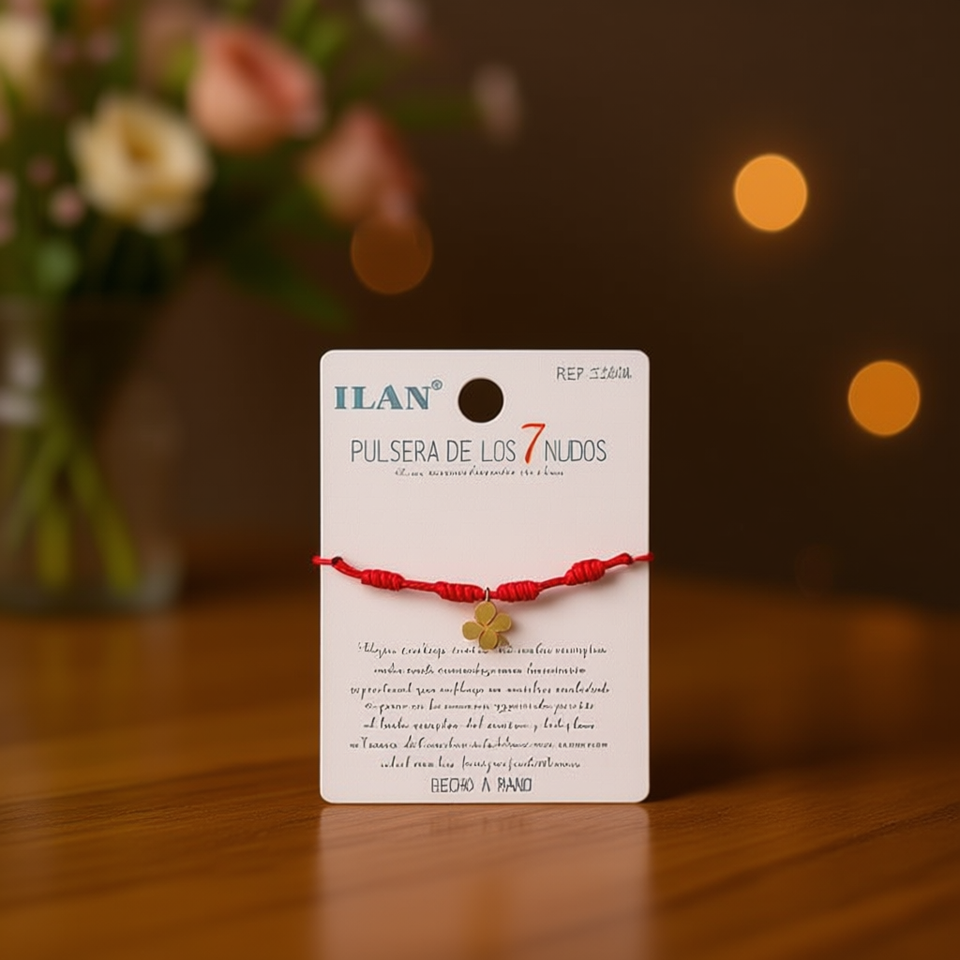 Braccialetto Ilan a Sette Nodi con Cordoncino Rosso e Ciondolo Quadrifoglio, Gioiello Fatto a Mano