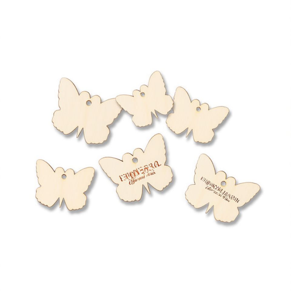 Etichette in legno a forma di farfalla Ilan 5x0,5 cm, 6 pezzi con spago di juta per etichettatura di capi d'abbigliamento