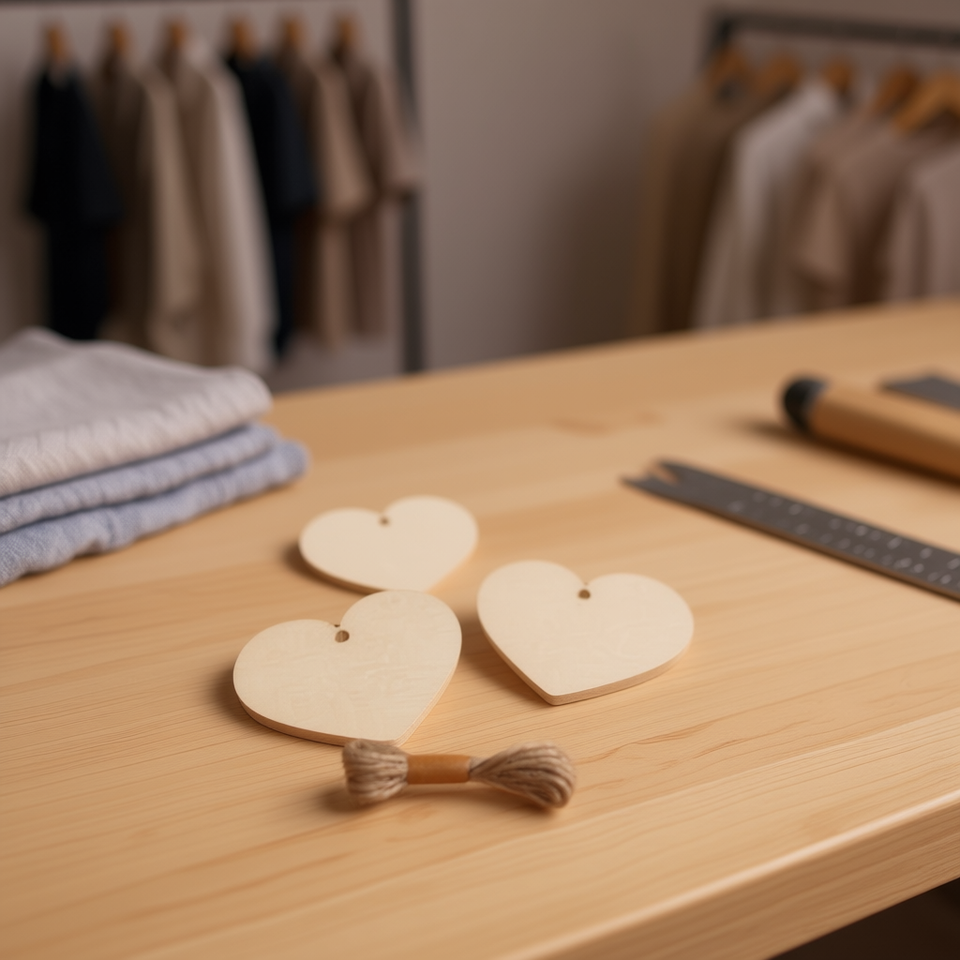 Etichette in Legno a Forma di Cuore Ilan 5x0,5 Cm con Cordino in Iuta, 6 Pezzi per Etichettatura Indumenti
