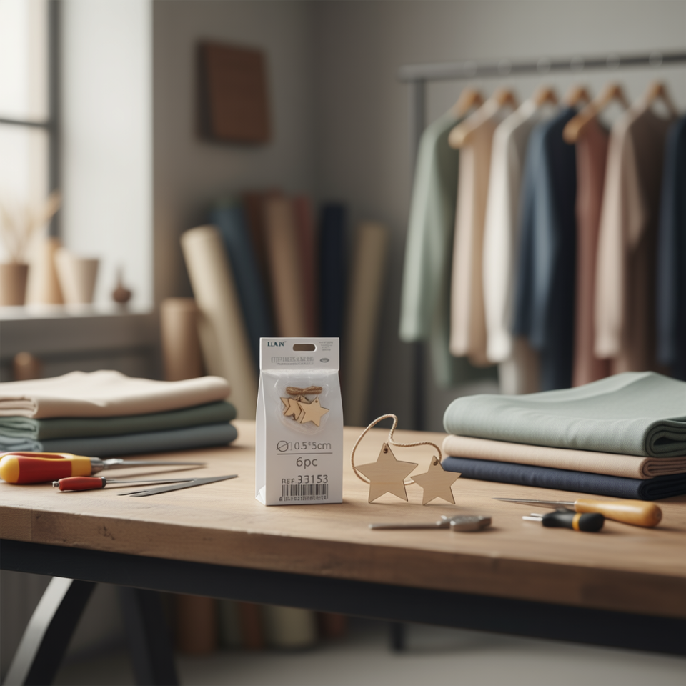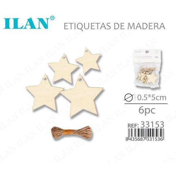 Etichette a Stella in Legno Ilan 5x0,5 cm con Cordino in Juta, 6 Pezzi per Etichettatura di Indumenti