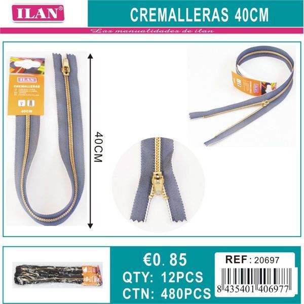 Cerniera Ilan 40 cm con denti in metallo dorato, tessuto denim per abbigliamento e borse