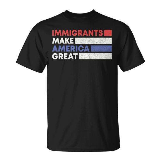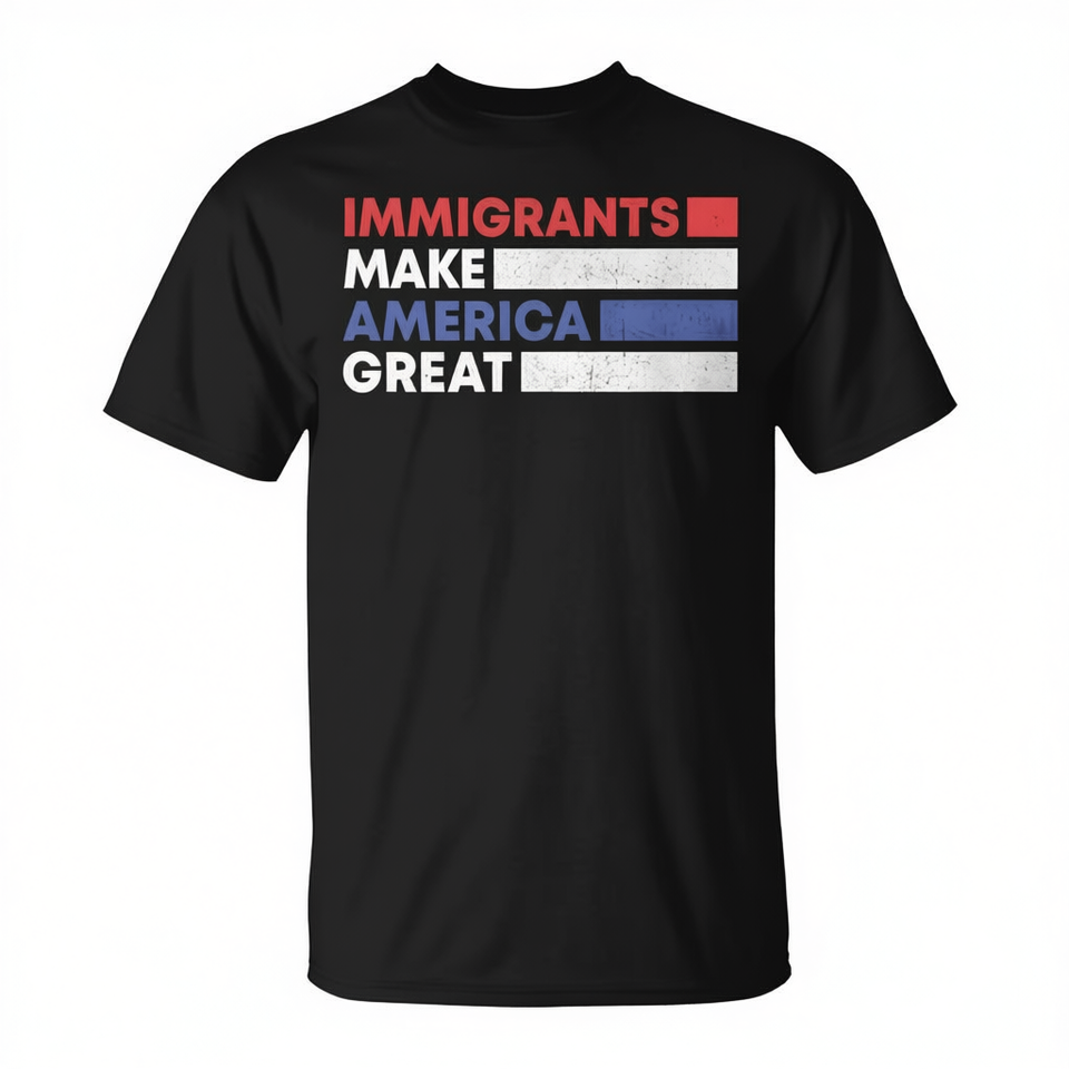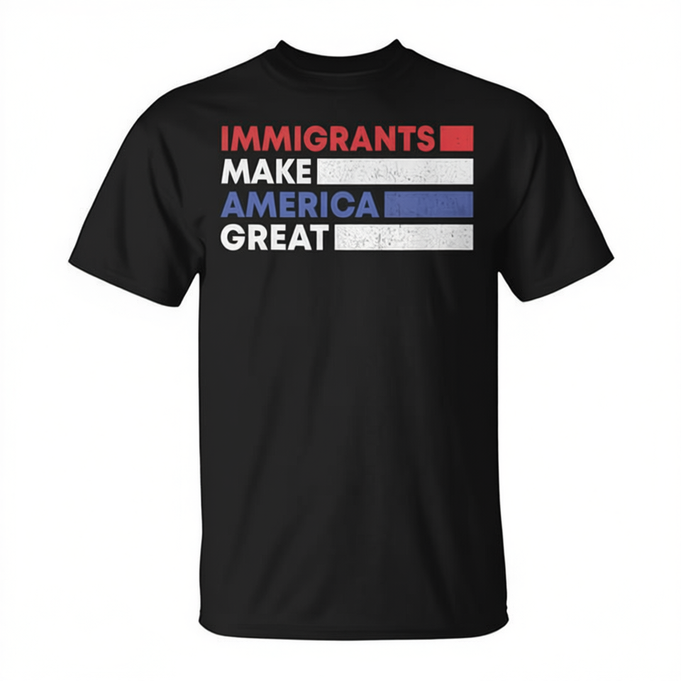 T-Shirt 'Immigrants Make America Great' Design Ispirato alla Bandiera Americana per Promozioni Pro-Immigrazione