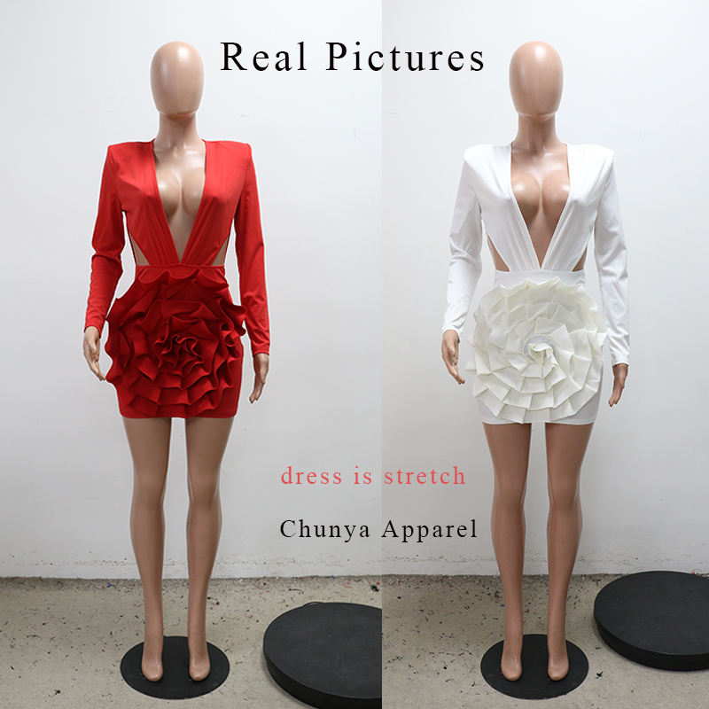Disponibile CY901591 Abito Corto con Scollo a V Profondo e Fiori, Maniche Lunghe Traforate, Vestito da Festa e Club per Donna 2025