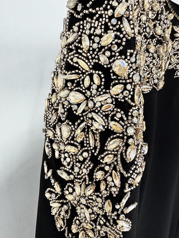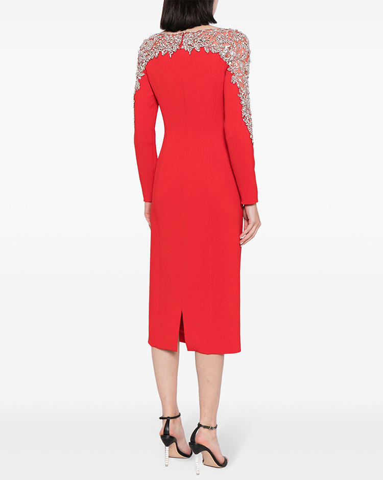 Disponibile Subito: Nuovissimo Abito Midi da Donna Tinta Unita, Maniche Lunghe e Scollo Rotondo, con Pregiata Lavorazione di Perline e Strass, Ideale per Ufficio e Casual