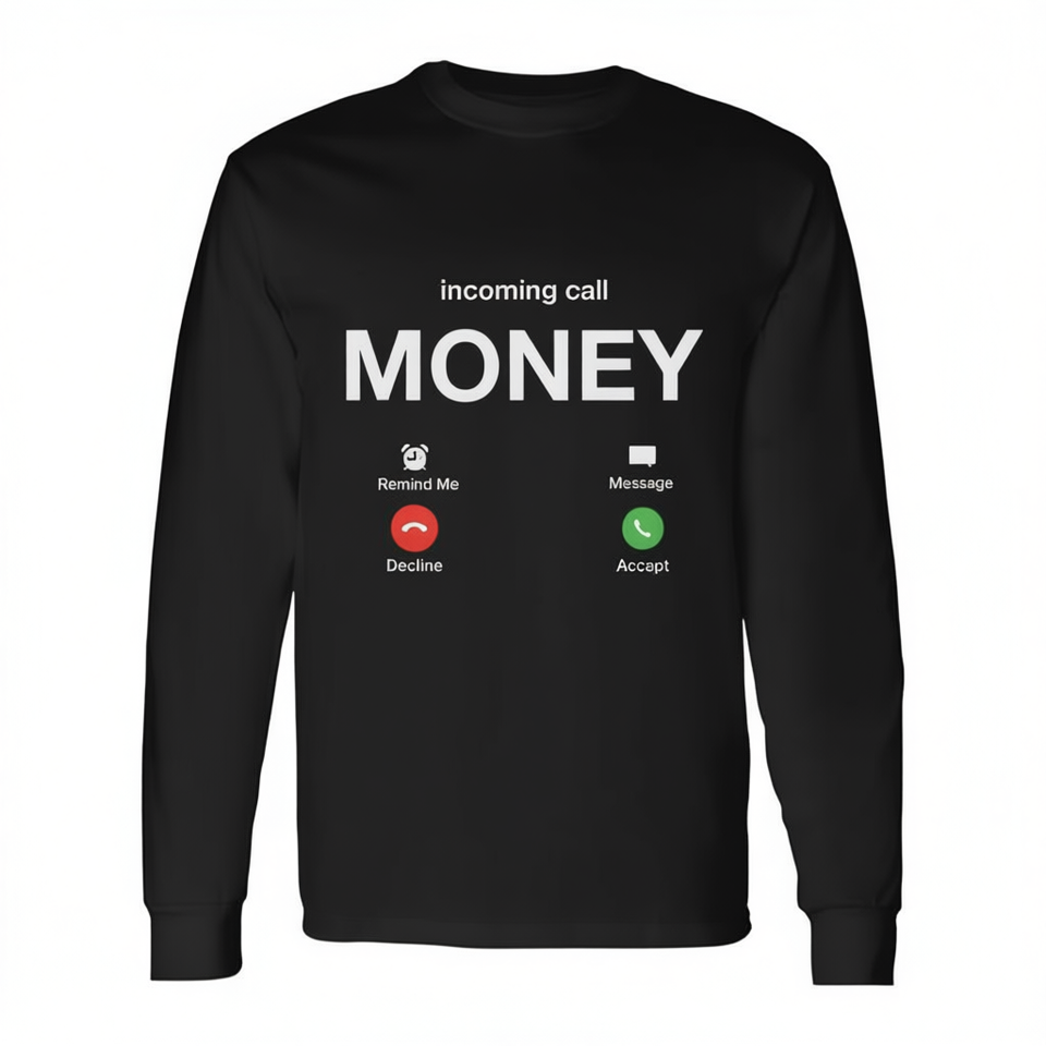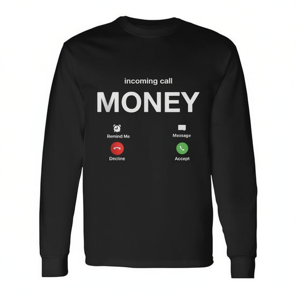 Incoming Call Money Long Sleeve T-Shirt Black Unisex Crew Neck Digital Printing Promotional Shirt