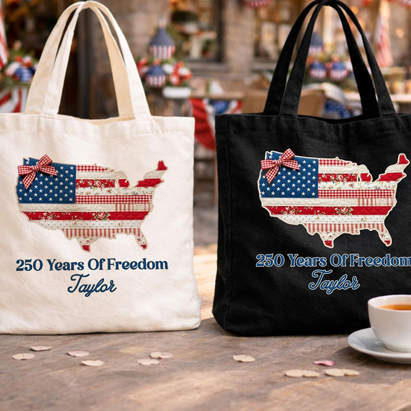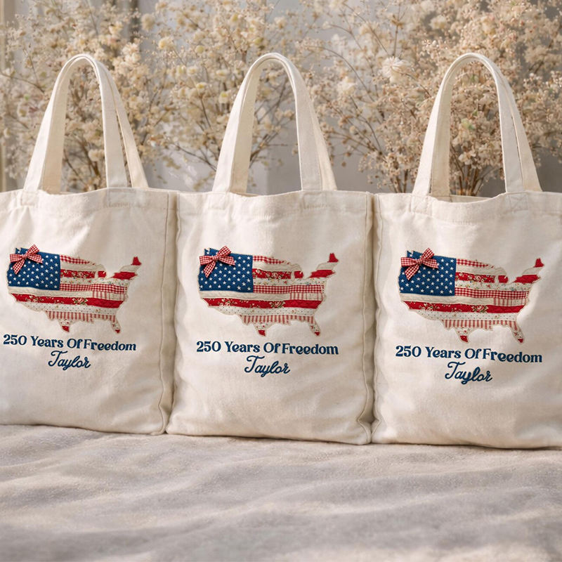 Borsa per il Giorno dell'Indipendenza Personalizzata con Bandiera Floreale Americana, Borsa per il 250° Anniversario, Borsa in Tela Personalizzata con Mappa USA e 250 Anni di Libertà