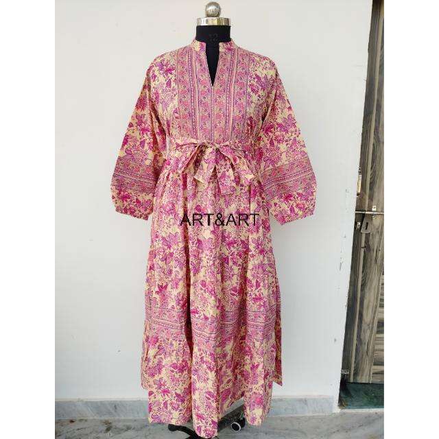 Abito Midi da Donna in Cotone Indiano con Stampa Floreale a Blocchi, Scollo a V, Maniche Tre Quarti, Silhouette Dritta, Romantico per l'Estate e la Spiaggia