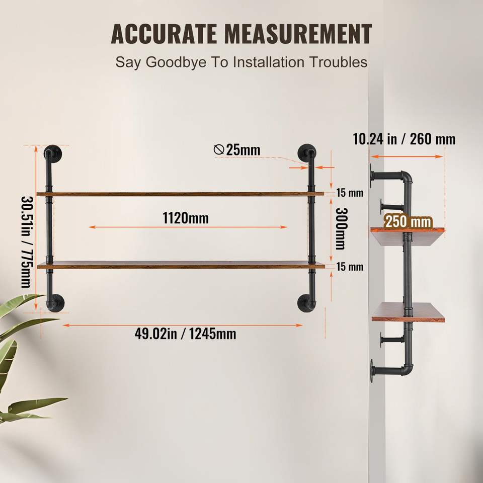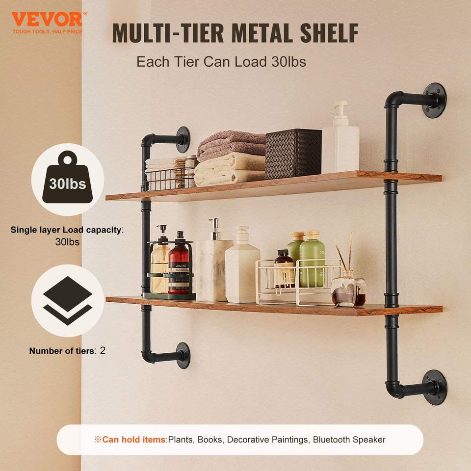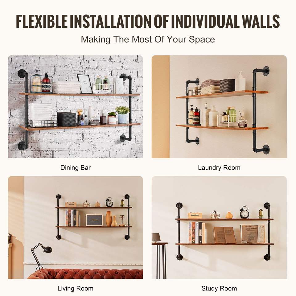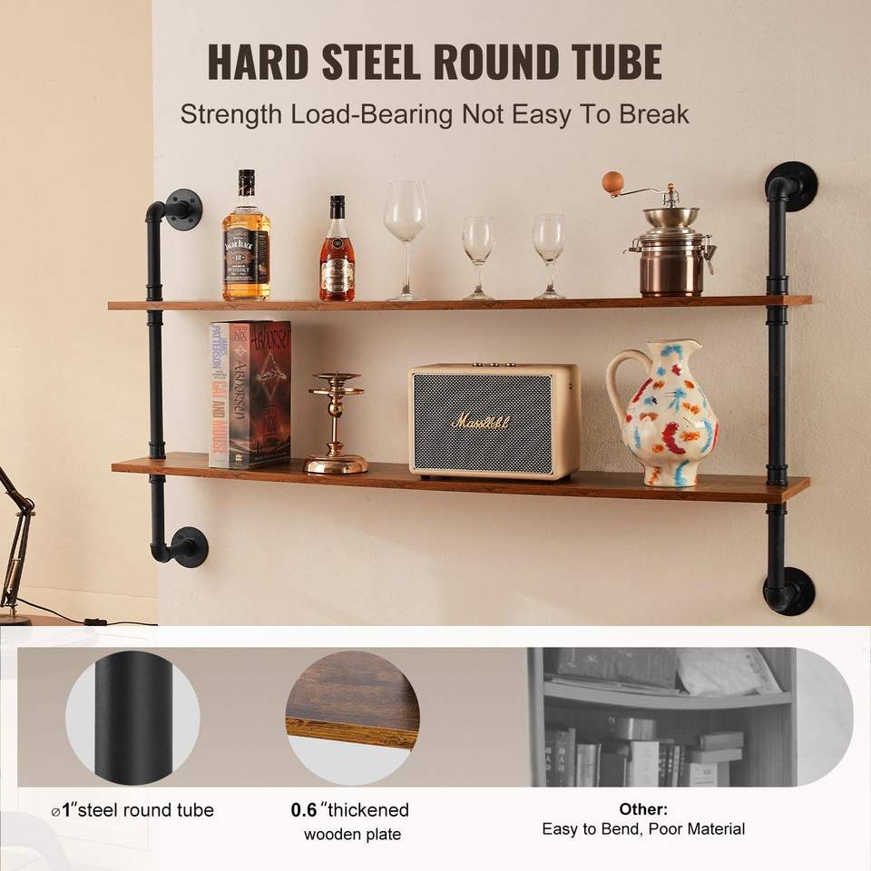 Mensola Industriale a 2 Livelli 48x9,84 Pollici in Legno Rustico con Tubi, Scaffale Galleggiante da Parete, Espositore con Staffe, Soluzione di Stoccaggio Sundr