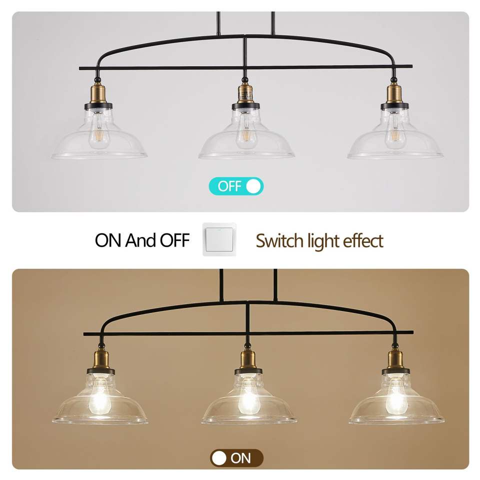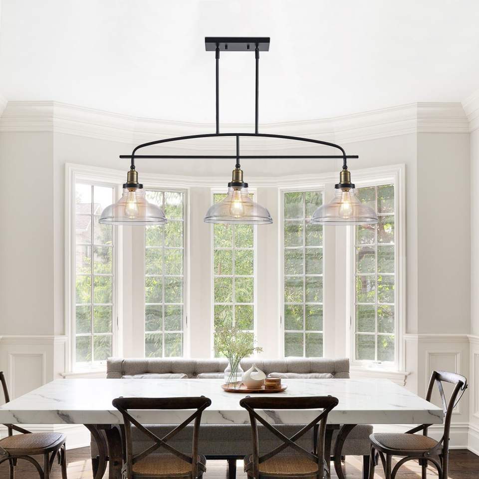 Industrial 3-Light Pendant Chandelier 45\" Modern Farmhouse Lighting Clear Glass Shades Black Metal Frame Adjustable Height for