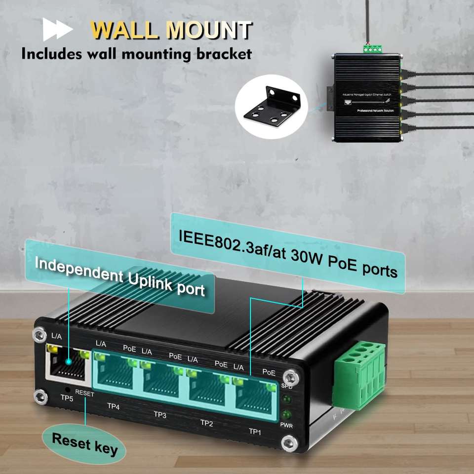 Industrial 4-Port PoE+ Gigabit Switch with 1 Uplink 120W 12-48VDC Web Management for Harsh Environment Network Applications