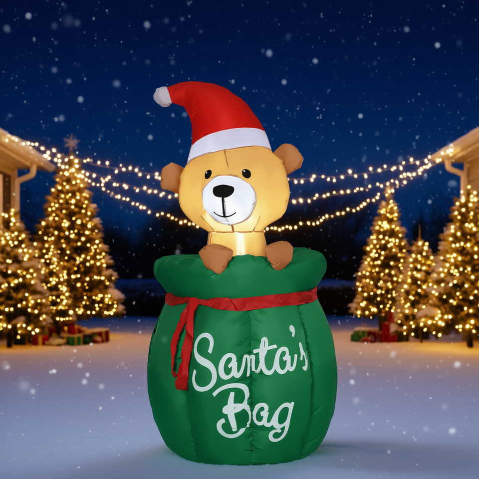 Decorazioni Natalizie Gonfiabili da Esterno per Giardino, Design Orsetto Carino, Sacco di Babbo Natale in PVC