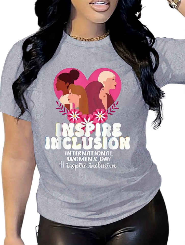 T-Shirt da Donna con Collo Tondo Inspire Inclusion, in Poliestere Lavorato a Maglia, Casual per Tutte le Stagioni, Manica Corta, Design per la Giornata Internazionale della Donna