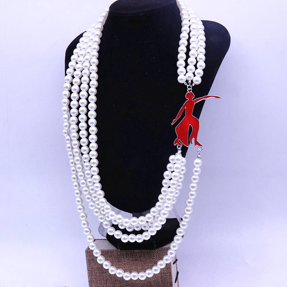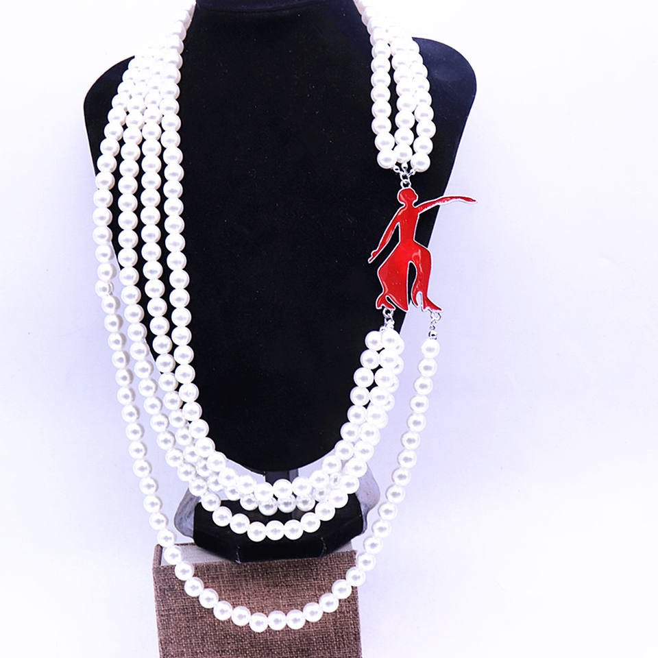 Collana da Donna Ispirata al Design di Gioielleria, Multistrato con Perle e Smalto, Charm 'Red Fortitude Dance Lady', Stile Delta Sorority Greca