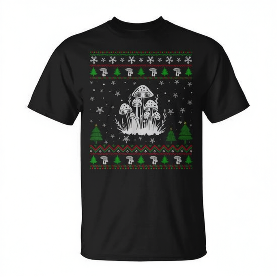 T-shirt promozionale per amanti dei funghi con design a maglione natalizio divertente