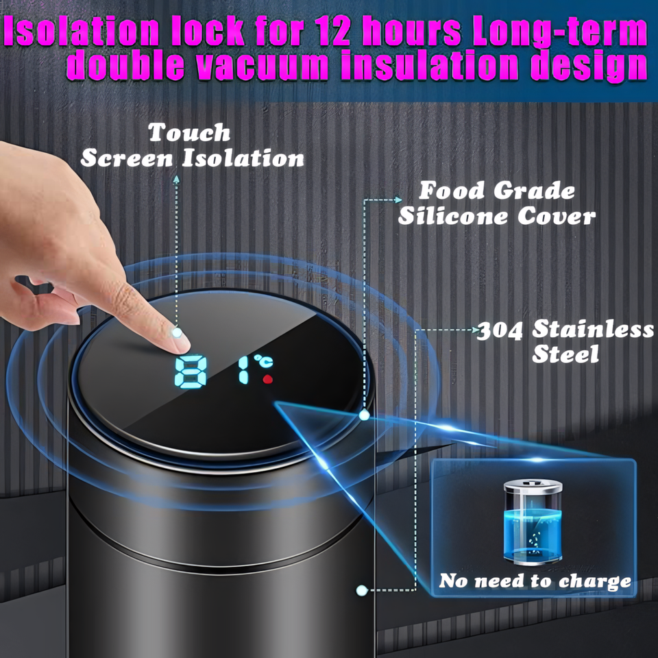 Portable, Business Services, Eco-Friendly, Large Capacity, Temperature Display, Stocked, Washable, Anti-Slip, Smart, Leak-Proof, BPA Free, double wall vacuum insulated, led temperature display, Thermal Insulation, Wide Mouth, spill proof, Narrow Mouth, Silicone sleeve, rubber bottomfeature