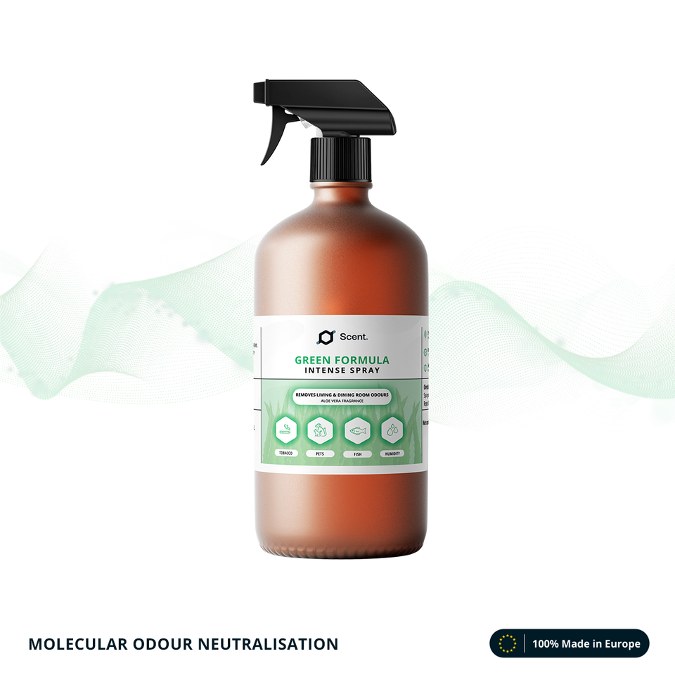 Neutralizzatore di Odori Spray Intenso Formula Verde: Odori di Tabacco, Animali Domestici, Pesce e Umidità - Bottiglia da 1L - Pronto all'Uso
