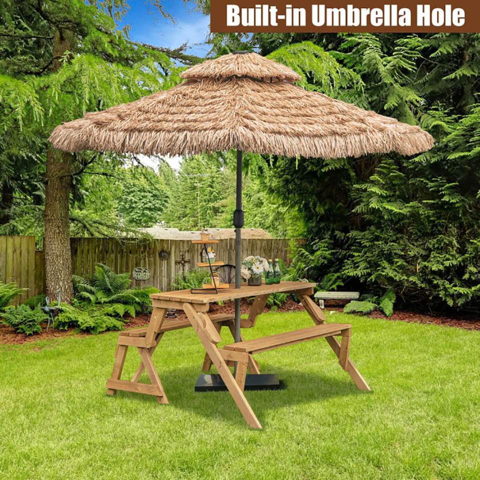 Set da Giardino 2-in-1 Intercambiabile in Legno: Tavolo da Picnic e Panca con Foro Integrato per Ombrellone