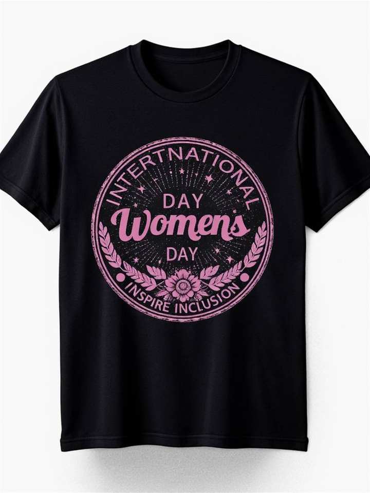 International Women's Day T-Shirt Black Cotton Short Sleeve Round Neck Casual Printed Floral Design Breathable Jersey Women's