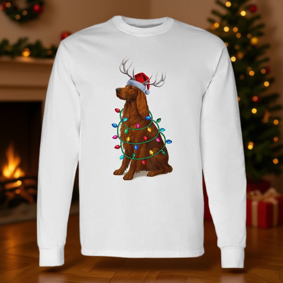 Maglietta a maniche lunghe Irish Setter con luci natalizie, cappello da Babbo Natale e renna