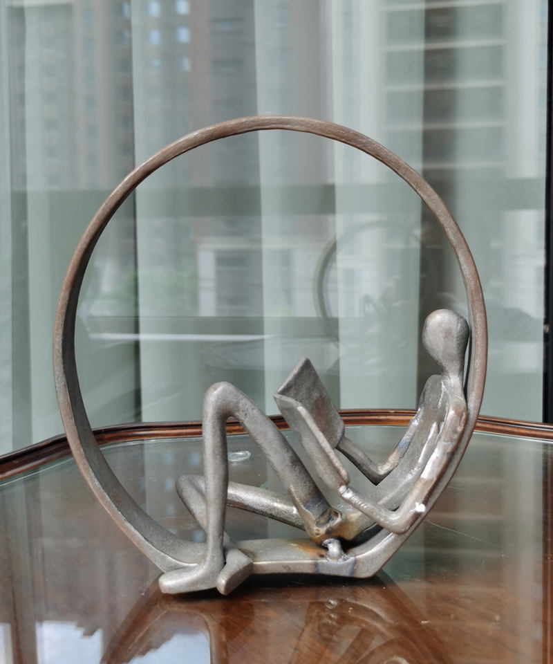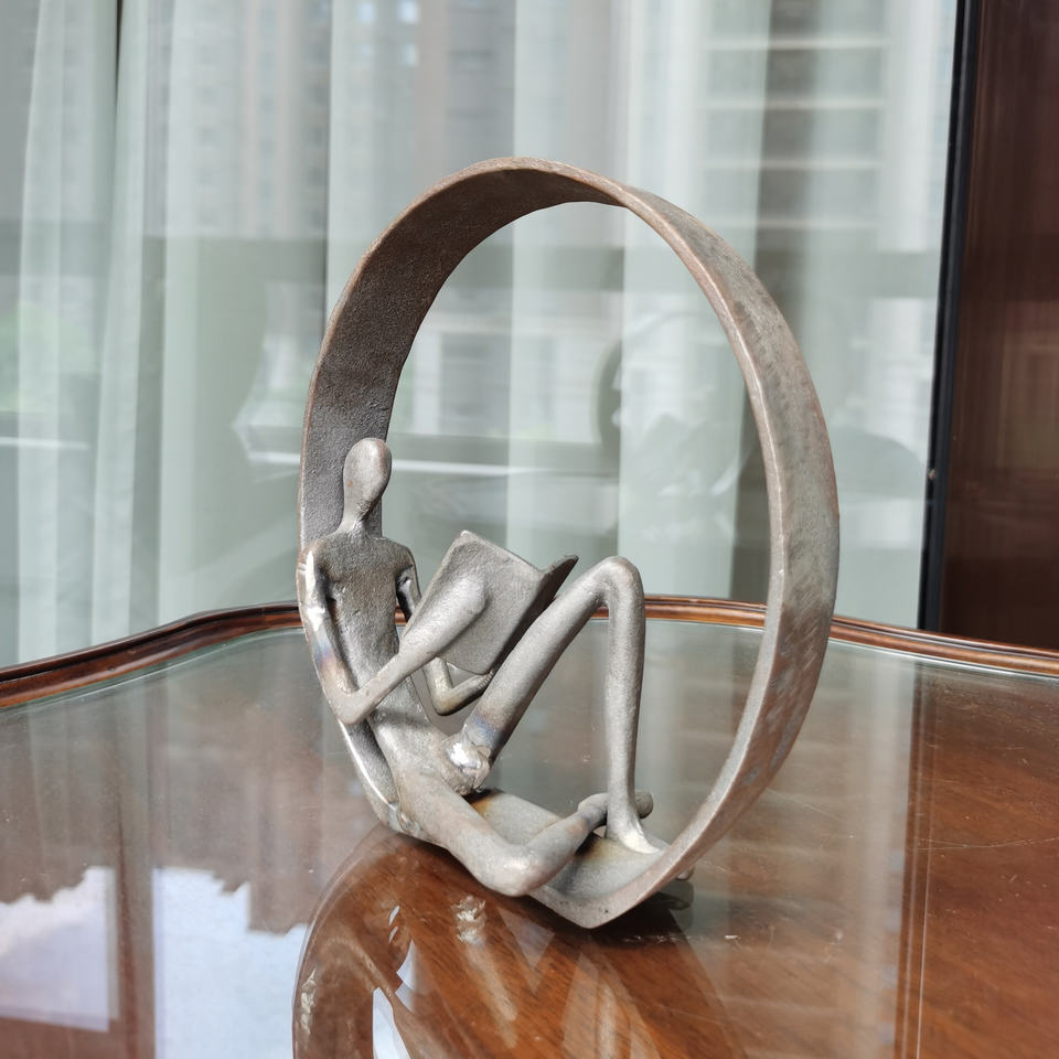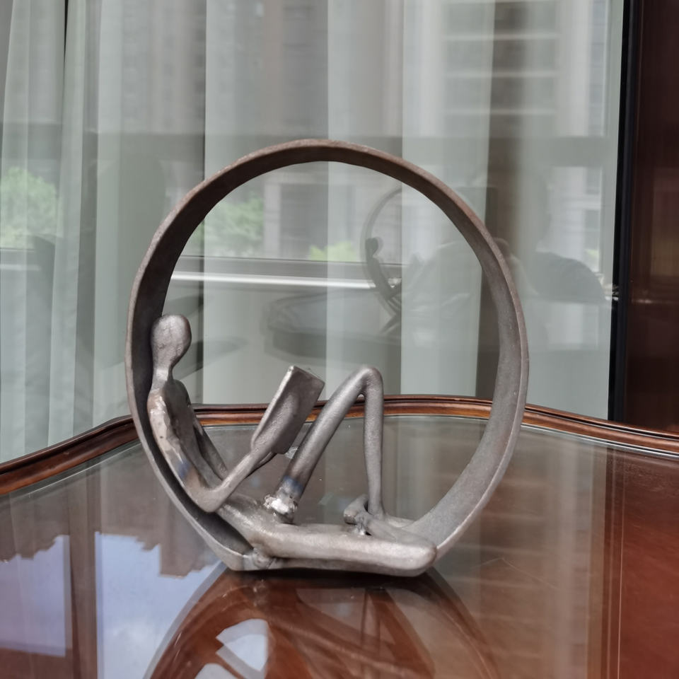Statuetta decorativa con finitura personalizzabile in ferro moderno astratto uomo posa sul cerchio tavolo Top