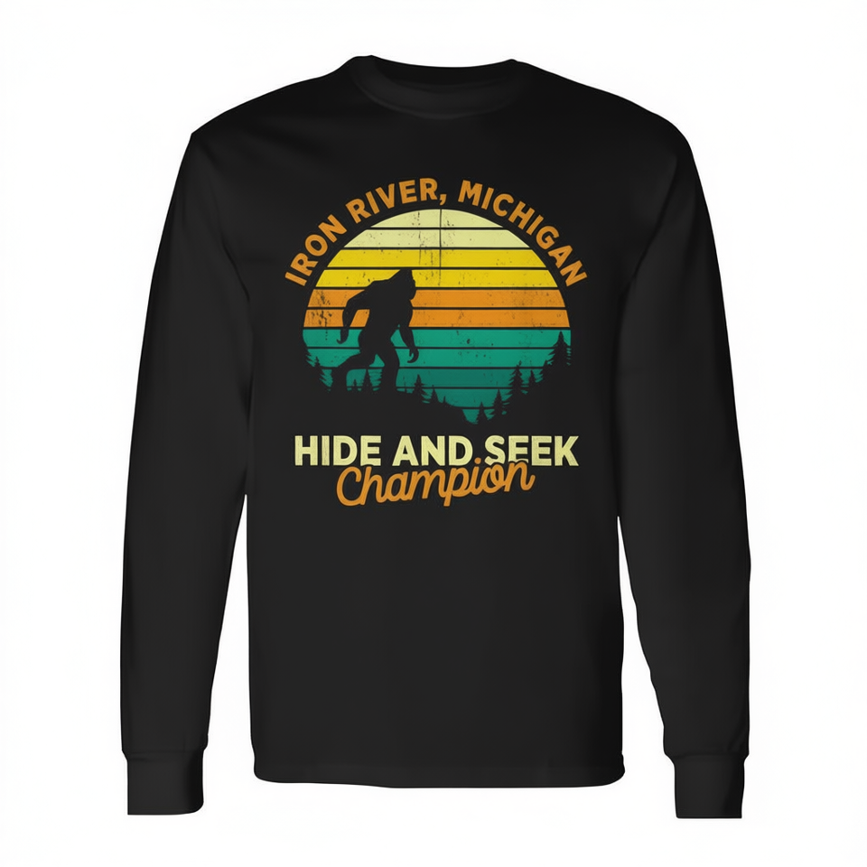 T-shirt a maniche lunghe Iron River Michigan Big Foot Souvenir, design retrò Hide And Seek Champion