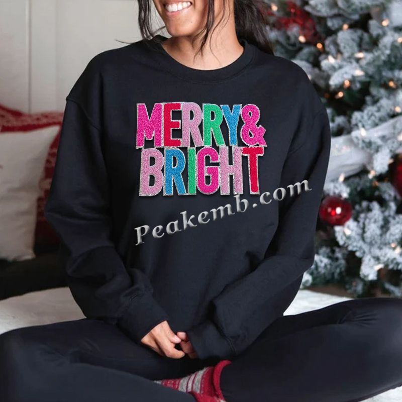 Patch Ricamata a Mano 'MERRY & BRIGHT' in Ciniglia con Bordi Argentati e Perline su Tela Personalizzabile in Vari Colori