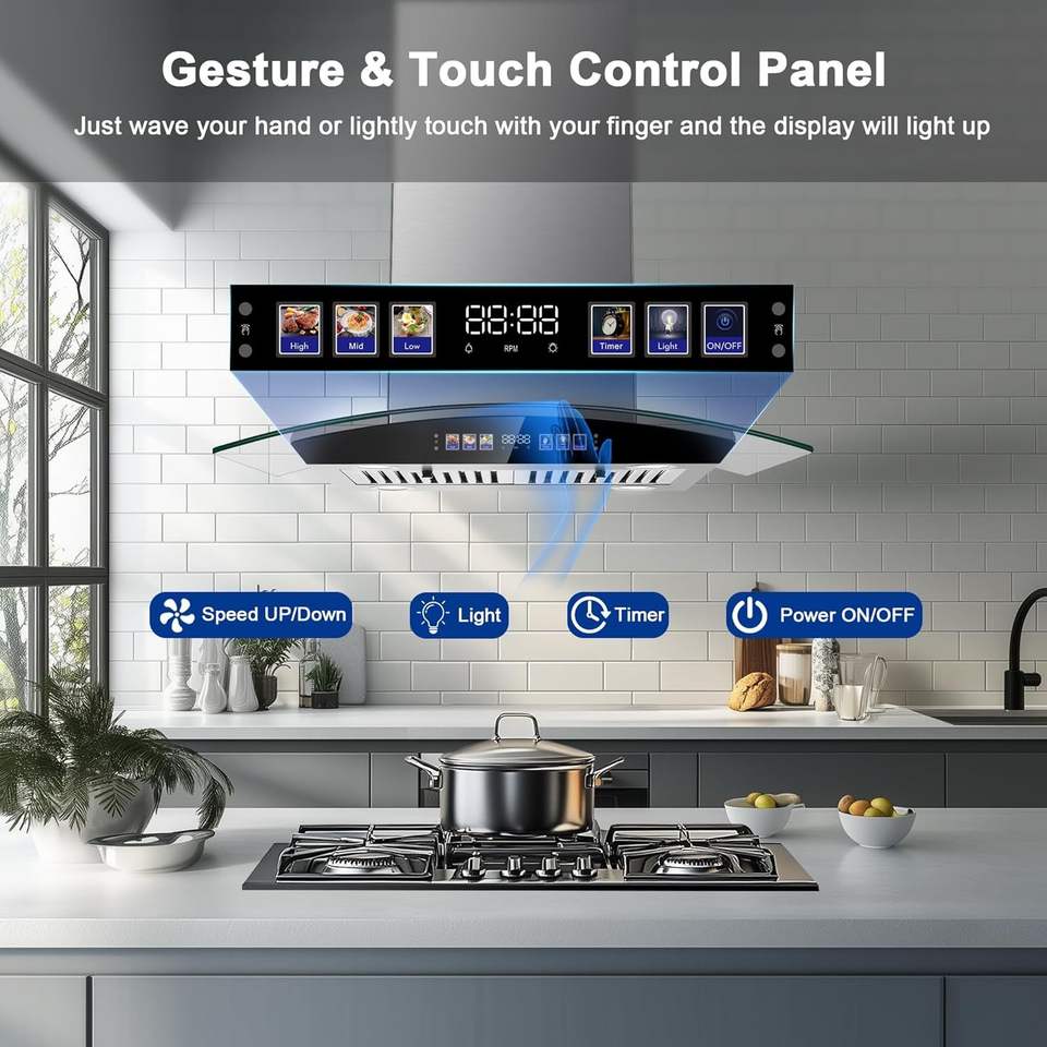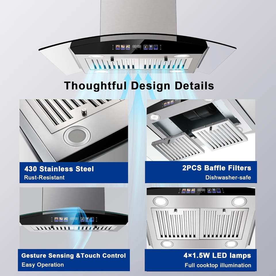 Cappa aspirante da soffitto Island da 30 pollici, 700 CFM, in vetro temperato, con controllo touch a sensore di movimento