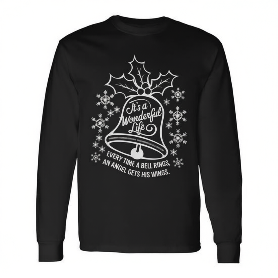 It's A Wonderful Life Christmas Movie Long Sleeve T-Shirt With Bell Design And Snowflakes Holiday Theme
