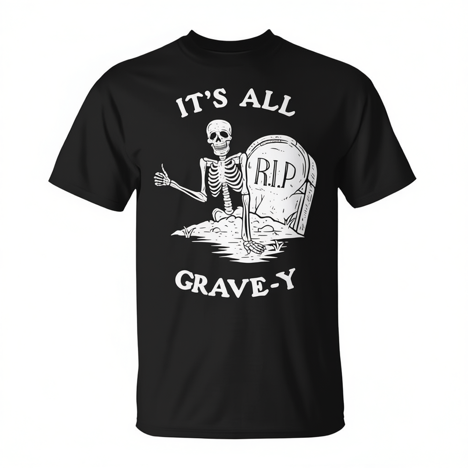 T-shirt con scritta "It's All Grave Y Skeleton Halloween Pun"