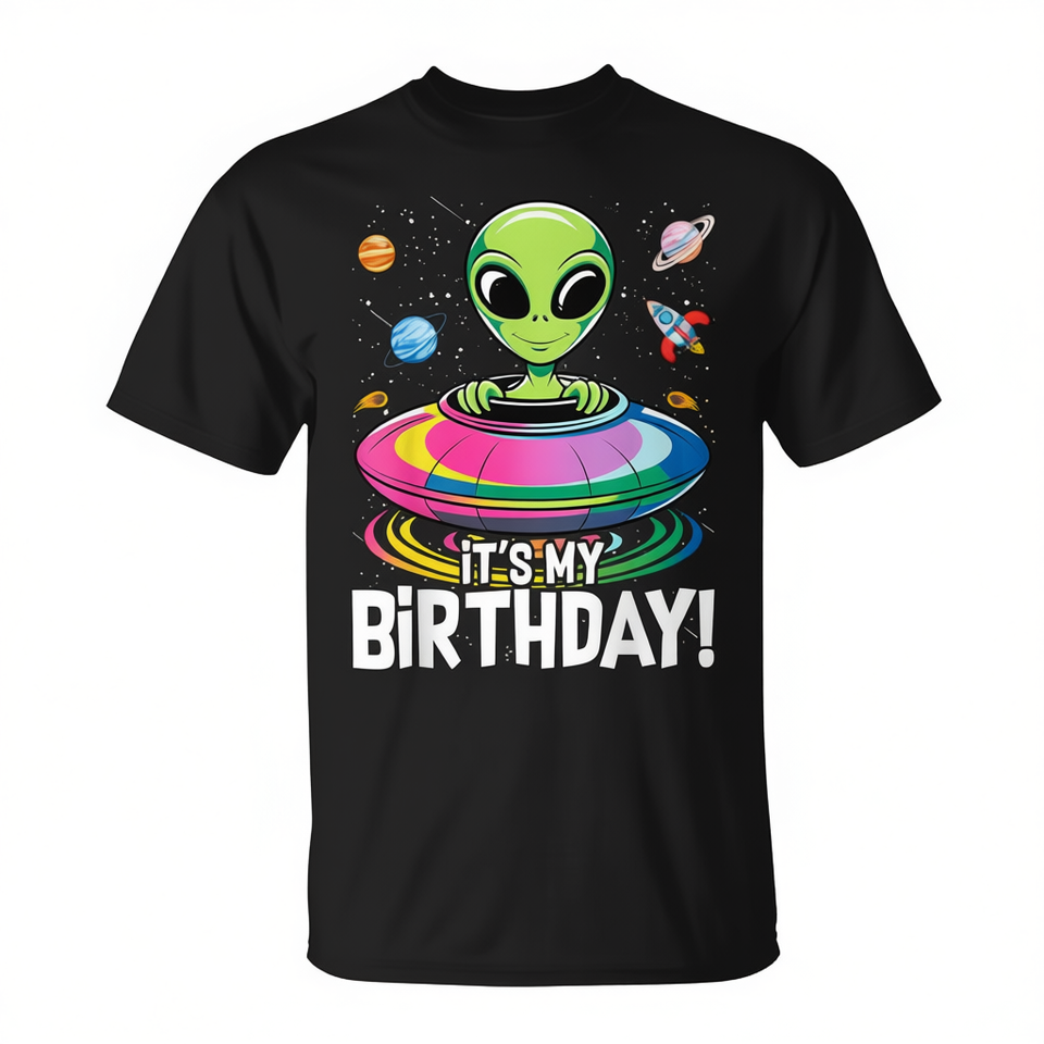 T-shirt Promozionale 'È il Mio Compleanno' con Simpatico Alieno e UFO Nello Spazio