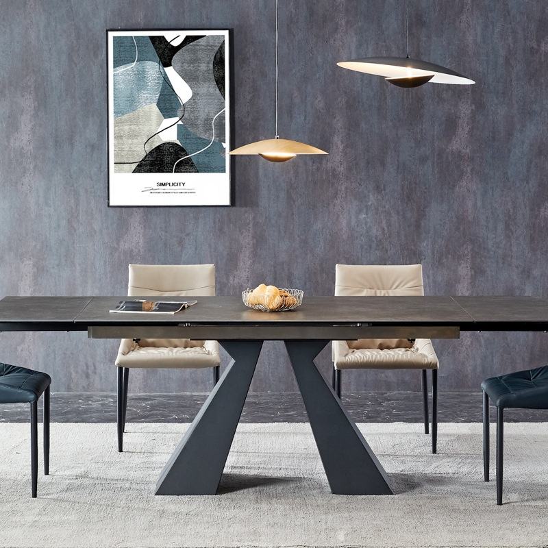 Italian Minimalism Black Powder Coated Metal Painting Two Extension Slide Panel Marble Colored Ceramic Hotel Dining Table Modern