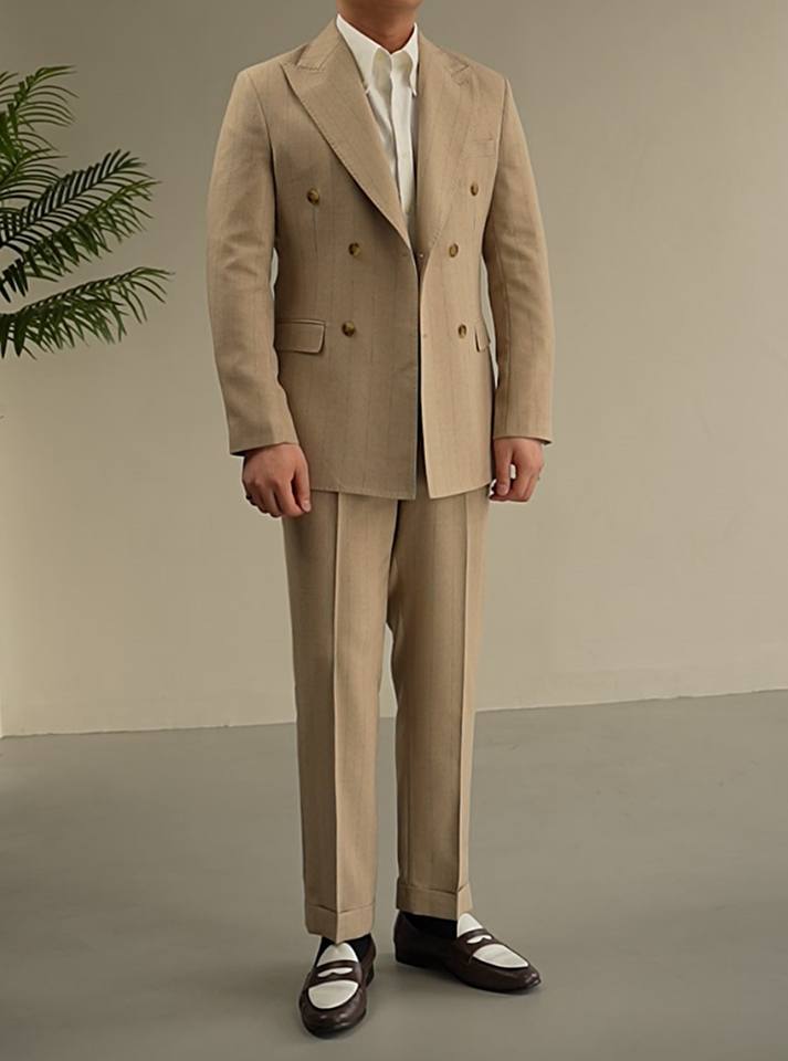 Blazer da Uomo Italiano Napoletano Doppiopetto a Righe Kaki, Vestito Classico Slim Fit Casual