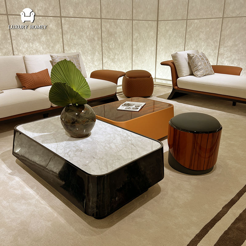 Collezione di Divani di Alta Gamma Italiana, Tavolino Moderno in Legno Impiallacciato, Arredamento di Lusso per Soggiorno, Mobili per Hotel con Braccioli in Legno Massello