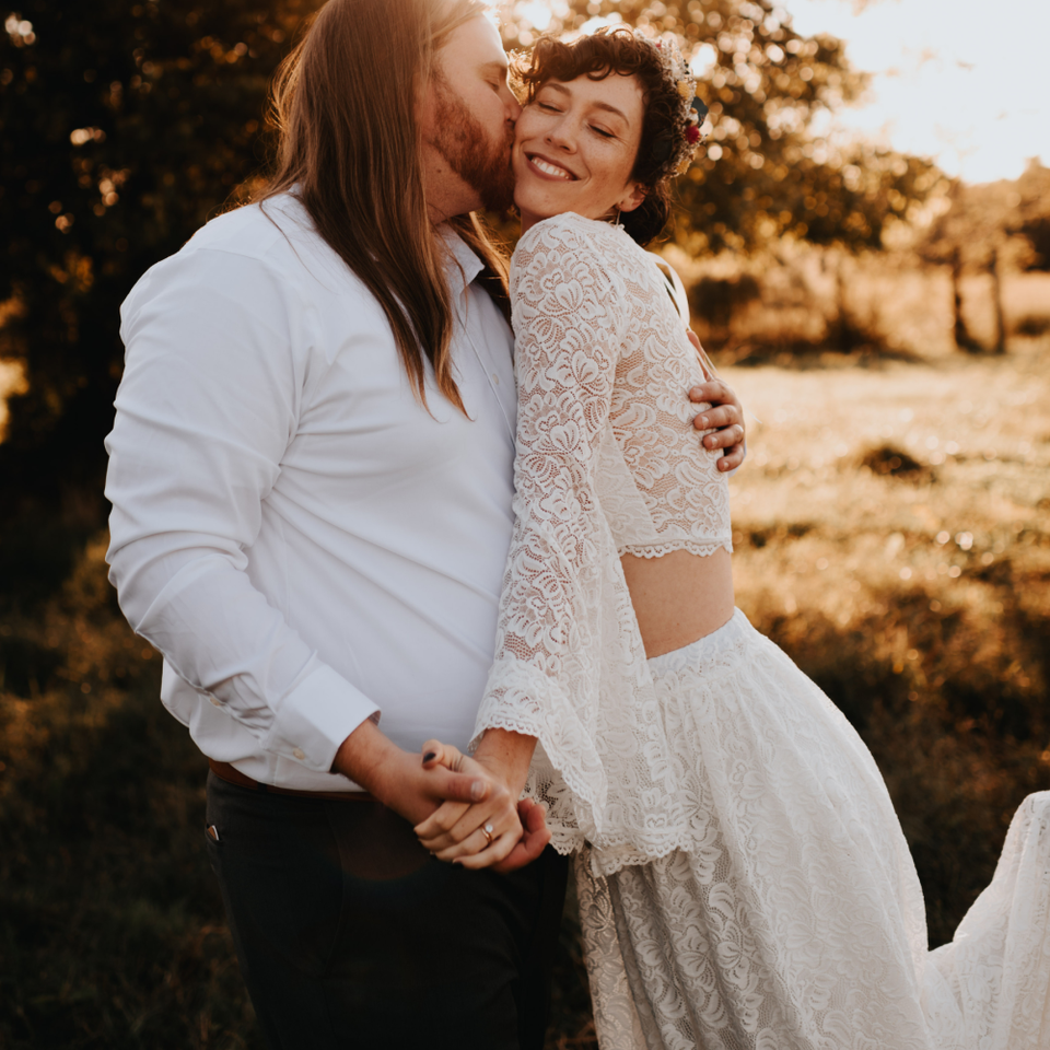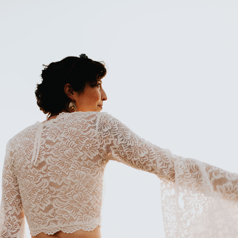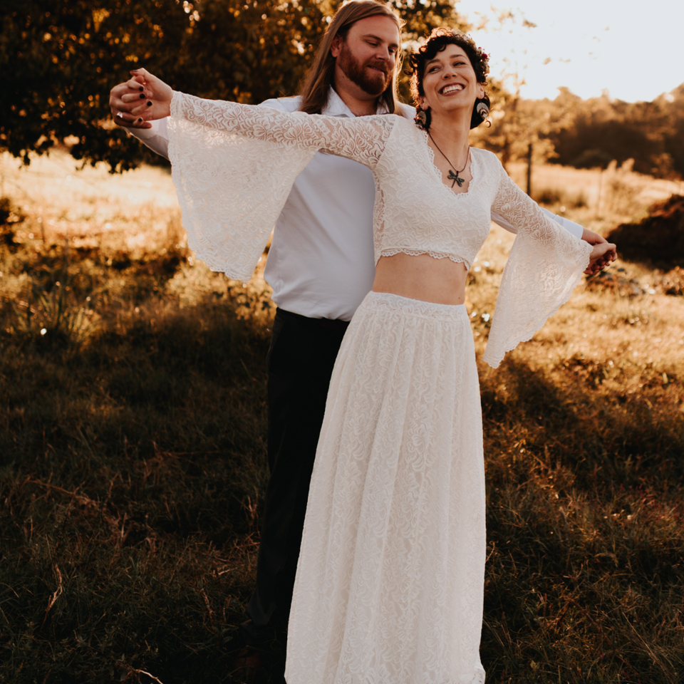 Top da Sposa in Pizzo Avorio con Maniche Lunghe a Campana, Abito da Sposa Corto con Scollo a V, Materiali Personalizzabili # 2062